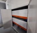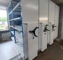 Разработали и установили передвижные стеллажи серии СБ-СГС с фальшполом. Каждая секция стеллажа оборудована стационарными и выдвижными полками, дверьми, а также ящиками под конкретный вид хранимого.