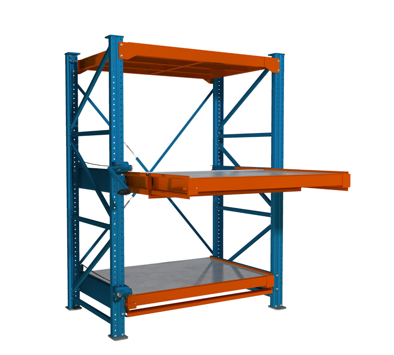 Конструкция выдерживает значительные нагрузки без потери устойчивости, а полное выдвижение полки позволяет получить свободный доступ к хранимым изделиям с трёх сторон, упрощая обслуживание и погрузочно-разгрузочные операции.